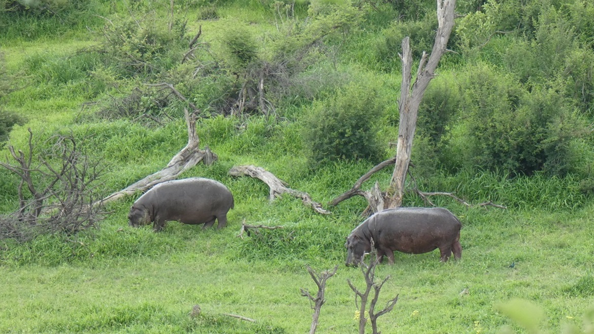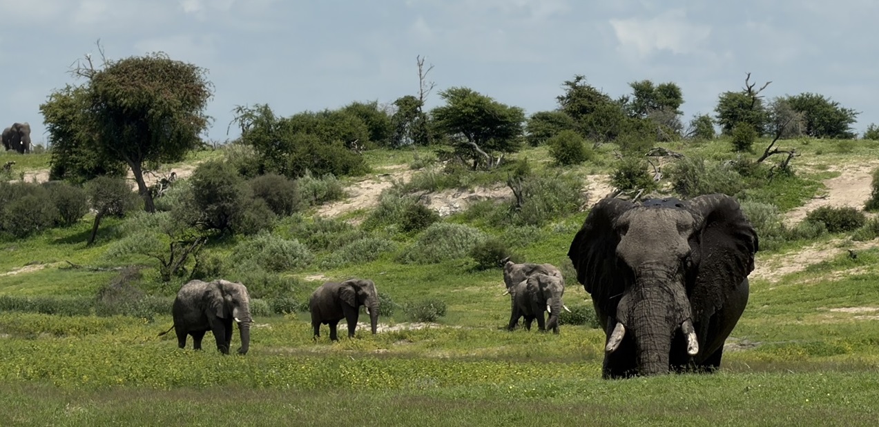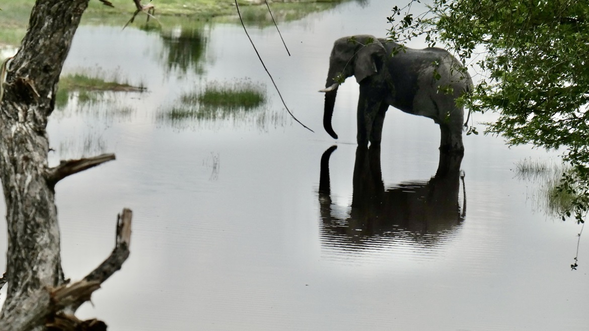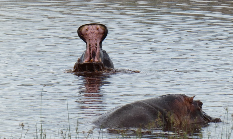 Wir schlafen überraschend gut im Dachzelt. Am nächsten Morgen um 5:30 rollen wir los zur ersten Pirschfahrt. Wir haben keine großen Erwartungen und was wir dann sehen, überwältigt uns: Impala, Kudu, Zebras, Giraffen, Gnus und vor allem eine Herde Rhinozerosse sind immer wieder zum Greifen nah. Silvia stellt ihre neue Kamera von Einzel- auf Dauerfeuer um, das Sortieren der Bilder wird anspruchsvoll werden ;-) Nach 3h Pirsch gibt es noch einen Kaffee und ein Omelett im Restaurant des Parks, dann geht es weiter nach Norden, Kurs auf Kubu Island.