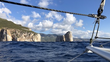 4.11.2019 12:00 Bei Sonne und recht plötzlich kommendem 38kn achterlichen Wind, jetzt ohne Groß und mit 20% Fock passieren wir gerade mit 8kn das Cabo Carbonara und hoffen, dass das nur der Kapeffekt ist. Der Wetterbericht spricht von 25kn Böen. Die Wellen sind ok, eigentlich ist es noch ziemlich gemütlich - drinnen. Michael beklagt den Verlust seines 20 Jahre geliebten schwarzen Pullis, an der Reling hatte er keine Chance.