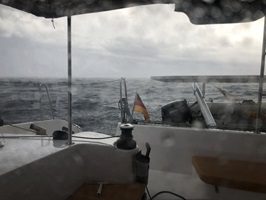 4.11.2019 12:30 Update, falls sich jemand Sorgen macht: der Wind benimmt sich wieder nach Wetterbericht. Komode 20kn, wir setzen das Groß und freuen uns auf die Passage. Dass an einem Kap die Beschleunigung 18kn beträgt, hatten wir auch noch nicht.