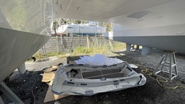 - Anschleifen des alten Antifoulings und Reparatur eines kleinen Gelcoatschadens unter dem Rumpf