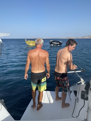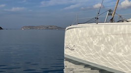 29.5.2021 - In drei Schlägen mit meist knappem Wind segelt graskarpfen nach Pareika auf Paros. Dort liegt auch die Elena von Dagmar und Hans, ein schönes Wiedersehen. Unterwegs vor Kea noch ein Ankermanöver der anstrengenden Art: Die Kette wickelt sich Nachts um eine Metallstrebe und ist nicht mehr freizubekommen. Also a) Tauchzeug klarmachen b) Boot an den Zweitanker hängen, um die Kette zu entlasten c) Tauchen und Kette freimachen d) Hauptanker aufholen e) Zweitankerleine mit Boje abwerfen f) Boot neu verankern g) Dinghi klarmachen und Zweitanker bergen h) Alles wieder aufräumen. Alles in allem zwei Stunden harte Arbeit. Gestern haben sich die Elena und der graskarpfen ein paar Meilen nach Süden vor den Ort Andiparos verholt, heute morgen ist ein Kitesurfkurs gebucht, es könnte allerdings heftig werden, inzwischen stehen schon 18kn Wind im Kanal zwischen Paros und Andiparos. In three legs with erratic winds, graskarpfen sails to Pareika on Paros. There I meet SY Elena with Dagmar and Hans, a nice reunion. The morning before I had an anchor maneuver of the strenuous kind: The chain wraps itself at night around a metal strut and is stuck. Procedure: a) Get the diving gear ready b) Place the second anchor to release the chain of the main anchor c) Dive and free the chain d) Retrieve the main anchor e) Drop the second anchor line with buoy f) Anchor the boat again g) Get the dinghy ready and retrieve the second anchor h) Clean up everything. All in all, two hours of hard work. Yesterday Elena and graskarpfen moved a few miles south to the village of Andiparos, this morning a kitesurfing course is booked. Could become tough for the beginner, in the meantime 18kn of wind blow through the channel.