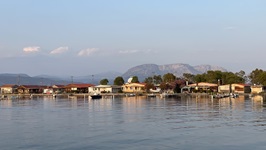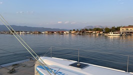 24.7.2021 - Gegen 11:00 setzt der thermische Wind ein, und wir segeln los Richtung Golf von Korinth. Zunächst schauklen wir für eine gute Stunde mit minimalem Wind auf dem Meer, dann frischt es auf auf 10-13 kn und unter Code 0, später Code D haben wir einen absolut traumhaften Segeltag. Immer zwischen 8 und 10 kn auf der Logge, fast ohne Welle und mit wunderbarer Aussicht auf den vorbeiziehenden Peloponnes und die Inseln Zakynthos und Kefalonia gleiten wir in Richtung der für uns noch unbekannten Lagune von Messolonghi. Die Einfahrt am späten Abend in den Kanal zur Lagune ist mystisch schön: Kleine Fischerhütten auf Pfählen säumen den Kanal und die Ankerbucht nach etwa einer Meile ist umrahmt von Bäumen und Tavernen. Toll hier!