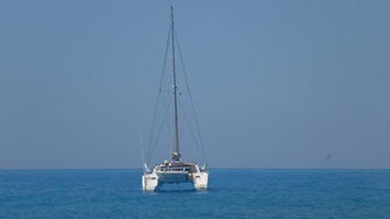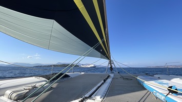 20.-22.8.2021 - Von Kastos aus ging es mit leichtestem Wind von 4-6kn Richtung Lefkas. Durch Zufall führte der Kurs ins Kielwasser eines anderen Katamarans und natürlich wurden die Segel dann ganz genau getrimmt, so dass sich gaskarpfen ganz langsam heranpirschen konnte. Auf gleicher Höhe mit der Catana 47 angekommen hatten wir dann Gelegenheit für ein Schwätzchen: Eduard lebt auf seinem Schiff und betreibt ein Projekt zur Walforschung. Mit seiner Drohne hat er dann ein paar herrliche Bilder der beiden ähnlichen Boote nebeneinander geschossen, die jetzt einfach gezeigt werden müssen. Wir freuen uns auch über die Bilder, weil sie das neue Code 0 von Quantum in ganzer Pracht zeigen, es steht wirklich super und zieht graskarpfen sehr ordentlich voran. From Kastos course was set to Lefkas in very light wind of 4-6kn. By chance, the course led into the wake of another catamaran and of course sails were immediately trimmed more precisely and graskarpfen caught up slowly. Arriving alongside with the Catana 47, we had the opportunity for a chat: Eduard lives on his ship and runs a project for whale research in the med, mainly along the catalonian coast. With his drone he then shot some wonderful pictures of the two quite similar boats side by side - a rare opportunity and I like the pics a lot. We are also glad to see the new Code 0 from Quantum has the shape it should.