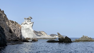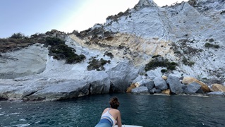 Gestern war eine kleine Rollertour über die Insel dran. Die Tiefblicke an der Westküste in unendlichen Blauschattierungen machten klar: Dort muss ich morgen einen Zwischenstopp machen. Vorher noch in Navionics ein paar Erfahtungsberichte angeschaut, Sand und Steine heißt es da - sehen kann man nichts, das Wasser hat zu viel Schwebteilchen von der Brandung. Mit etwas mulmigem Gefühl fällt der Anker auf 7m und ich schwimme an Land. Tolle Stimmung, bis zum Anker lichten - die Kette hängt sofort. Kurzum: Zweimal runter, ziemlich viel Arbeit da unten, riesige Boulder, immer wieder bekomme ich ein Stück frei und warte bis der Kat soweit vertrieben ist, dass er sich die freigewordene Kette holt. Anstrengend! Aber es klappt und ich nehme mir vor, bei der Wahl der Ankerplätze nun definitiv wählerischer zu werden.