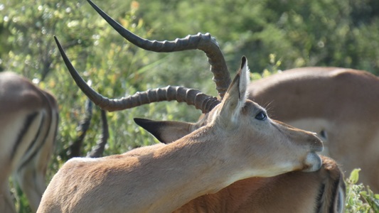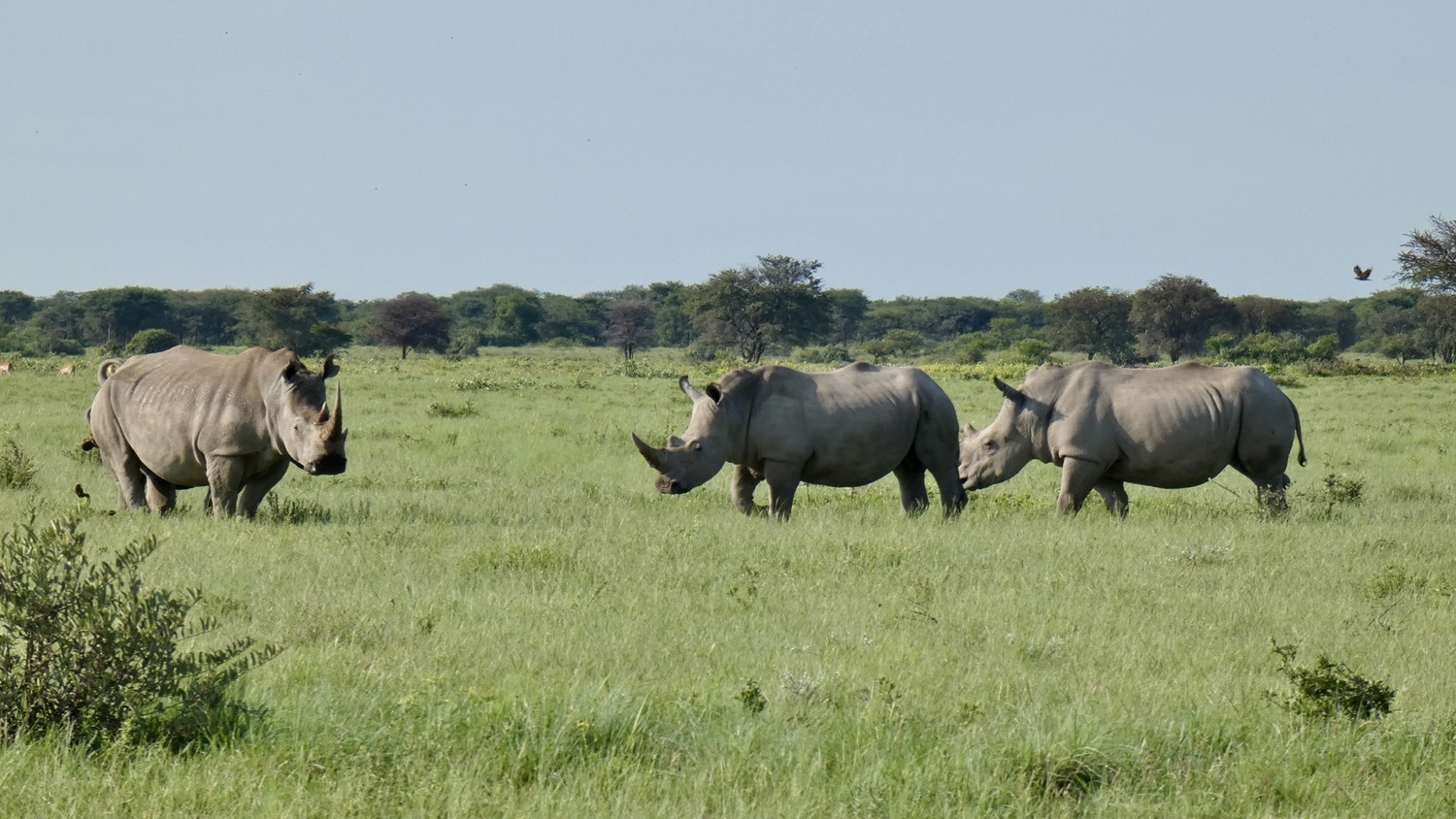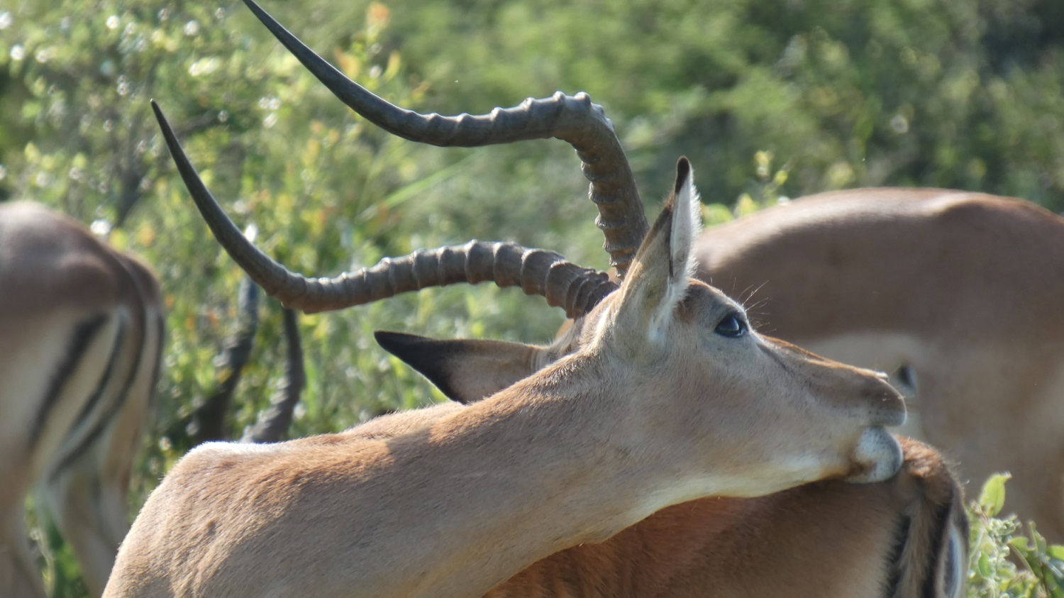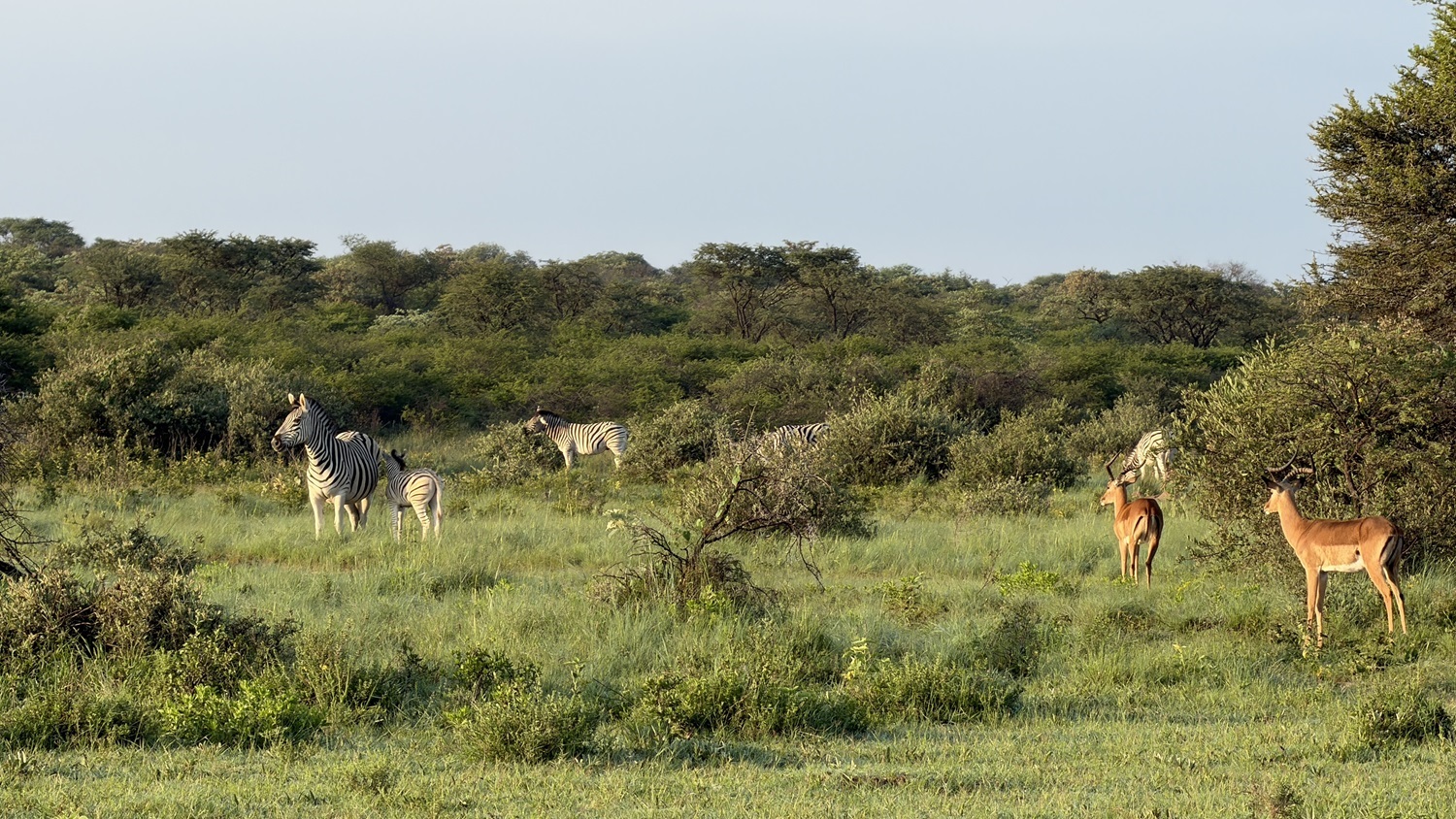 Wir schlafen überraschend gut im Dachzelt und am nächsten Morgen um 5:30 rollen wir los zur ersten Pirschfahrt. Wir haben keine großen Erwartungen und was wir dann sehen, überwältigt uns: Impala, Kudu, Zebras, Giraffen, Gnus und vor allem eine Herde Rhinozerosse sind immer wieder zum Greifen nah. Silvia stellt ihre neue Kamera von Einzel- auf Dauerfeuer um, das Sortieren der Bilder wird anspruchsvoll werden. Nach 3h Pirsch gibt es noch einen Kaffee und ein Omelett im Restaurant des Parks, dann geht es weiter nach Norden, Richtung Kubu Island.