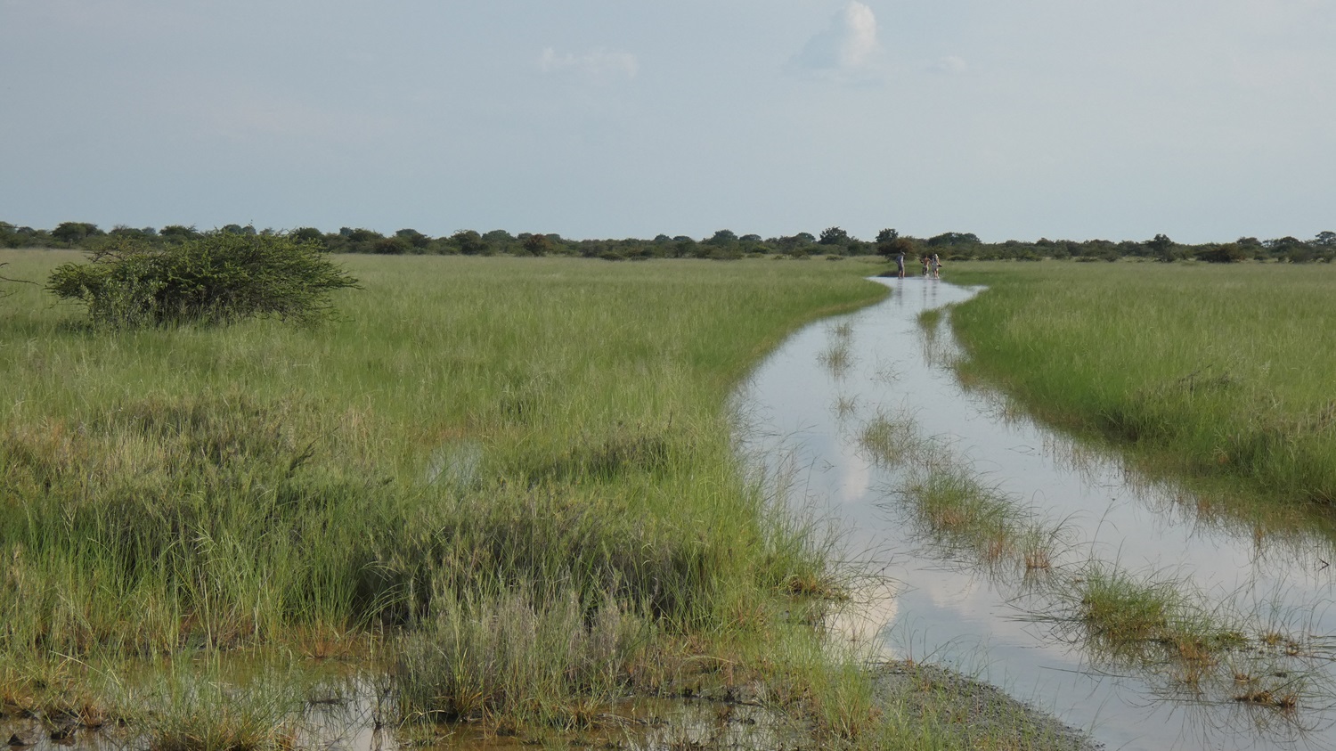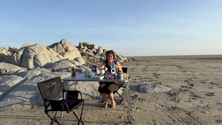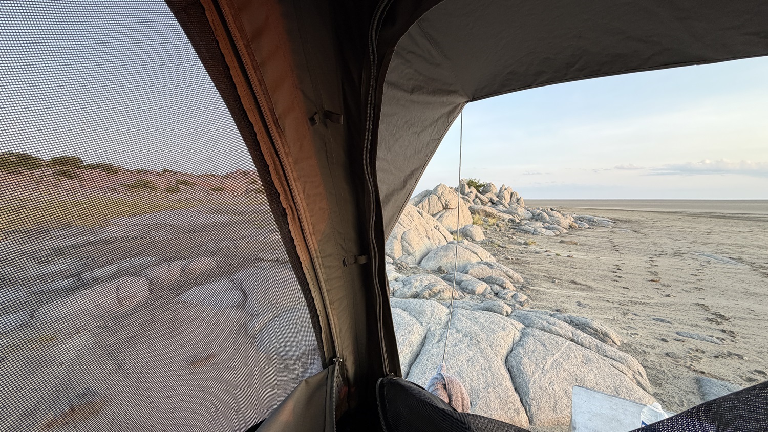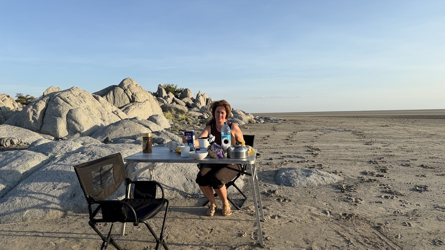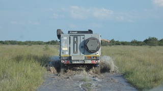 27. & 28.12.25 - Zuhause haben wir faszinierende Bilder von Kubu Island gesehen, einer kleinen Felseninsel mitten im Salzmeer der Sowa Pfanne. Da wollen wir hin! Leider ist die Befahrbarkeit nur in der Trockenzeit einfach, aber wir wollen es versuchen. An der Rangerstation in Mmathsumo fragen wir nach und bekommen eine vage Antwort: Ja, könnte gehen, ist teilweise naß. "Fahrt nicht durch die Pfanne, sondern den trockeneren Umweg über Thanbatskudu". Nun denn, wir versuchen es, lernen an einem Aussichtspunkt eine Gruppe aus Südafrika kennen und fahren vor diesen weiter, um nicht zu viel Staub zu schlucken. Nach gut 10 km über die Ausläufer der Pfanne wird der Weg immer feuchter und steht schließlich ganz unter Wasser. Da trauen wir uns nicht durch, versuchen seitlich über das Gras zu fahren - und stecken nach wenigen 100 m fest. Mit Mühe und Sperrdifferential kämpfen wir uns zurück. Zu Fuß erkunden wir mögliche Alternativen, da kommt der Treck mit vier Südafrikanern angefahren. Der Erste macht den gleichen Fehler wie wir und bleibt an der selben Stelle stecken. So lernen wir uns kennen, werden eingeladen, uns dem Tross anzuschließen und leisten gleich mal unseren Beitrag, indem wir den festgefahrenen Wagen aus dem Sumpf ziehen. Wir lernen viel von den sehr netten Jungs und Mädels: z.B., dass es bei diesen Sumpfwegen auf der Spur, selbst wenn sie unter Wasser steht, immer am besten geht. Mit vereinten Kräften und einigen Manövern schaffen wir es gemeinsam bis Kudu Island. Die Hüter des Campgrounds sind völlig platt, das wir es bis zu Ihnen durchgekommen sind. Es wird ein netter Abend, nur die Besteigung der Insel schaffen wir zeitlich nicht mehr im Hellen. Am nächsten Morgen geht es um 6:30 weiter mit unserer "Bootsfahrt", 90 km Piste bis zur Teerstraße von Nata nach Maun liegen vor uns. Bis 2 km vor dem Ende geht alles gut, dann steckt ein Einheimischer in einem Schlammloch, den wir erst mal rausziehen. Gut übrigens, dass ich die alte Großfall vom graskarpfen dabei habe. Aber dieses Loch ist definitiv unfahrbar, wir waten die ganze Länge ab, die Spurrillen sind zu tief, selbst für den "Mighty Hilux", wie die Buren unsere Kiste nennen. Wir versuchen eine Umfahrung und bleiben stecken, dann scouten wir andere Möglichkeiten weiter südlich und nach einigen weiteren Adrenalinschüben und Schleppaktionen stehen wir nach 5 h und 90 km endlich auf Asphalt. Geil war´s!